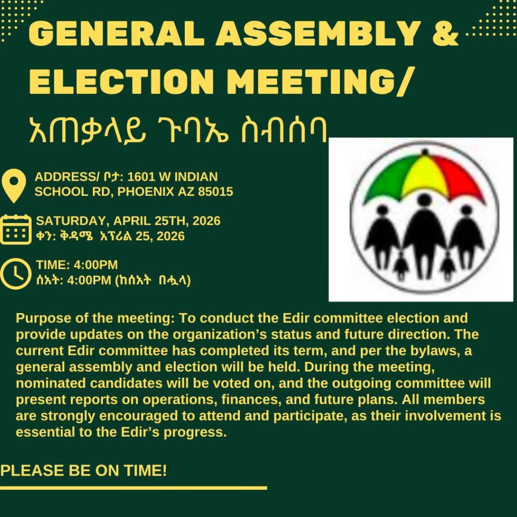The current Edir committee has completed their term this year. Per the Edir bylaws, there will be an election this year. We will have a General assembly and election on 4/25/2026. A list of members who are believed to be eligible for this election have been nominated. On the above mentioned date, we will hold voting. In addition, the current committee members will provide a short report on the current state of the Edir and financials as well as future visions and goals. It is very important for all members of the Edir to attend this meeting and actively participate. We respectfully urge you to attend the meeting on April 25 at 4 Pm. at 1601 W Indian School Rd Phoenix, AZ 85015